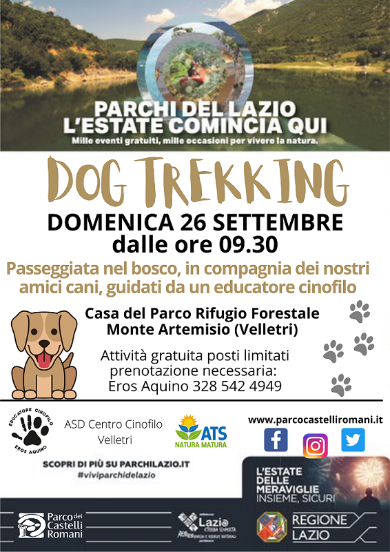 Domenica 26 settembre dalle ore 09.30 “Dog Trekking” - Un educatore cinofilo sarà disponibile per tutta questa giornata dedicata ai nostri amici cani per rispondere a domande e per guidarvi in una splendida passeggiata nel bosco- Centro Cinofilo Velletri, attività gratuita posti limitati prenotazione necessario: Eros Aquino ASD Centro Cinofilo Velletri - 328 542 4949