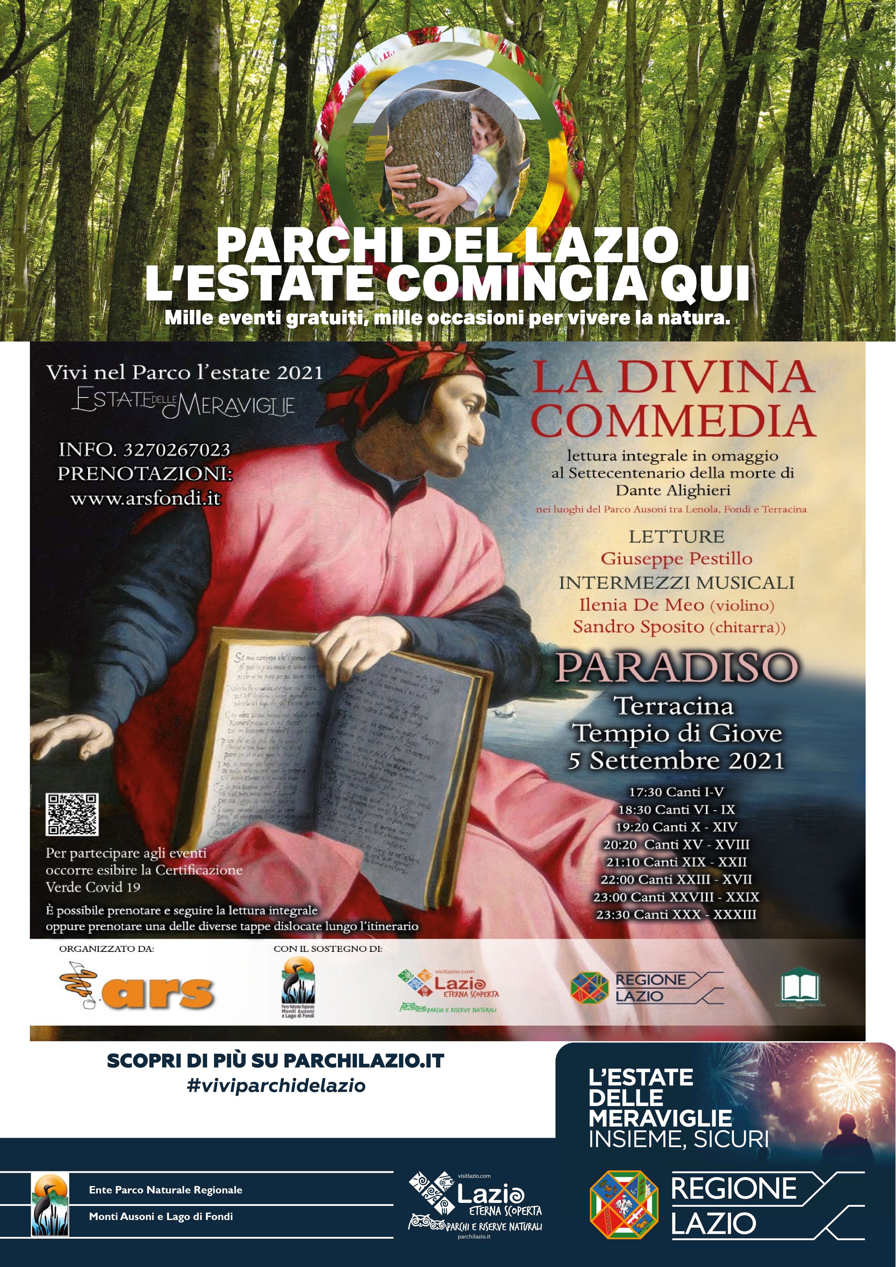 L’Ente Parco Monti Ausoni e Lago di Fondi ha patrocinato un omaggio a Dante, a 700 anni dalla sua morte, promuovendo una lettura integrale della Divina Commedia itinerante articolata in tre appuntamenti in luoghi del Parco Ausoni, nei comuni di Lenola, Fondi e Terracina.