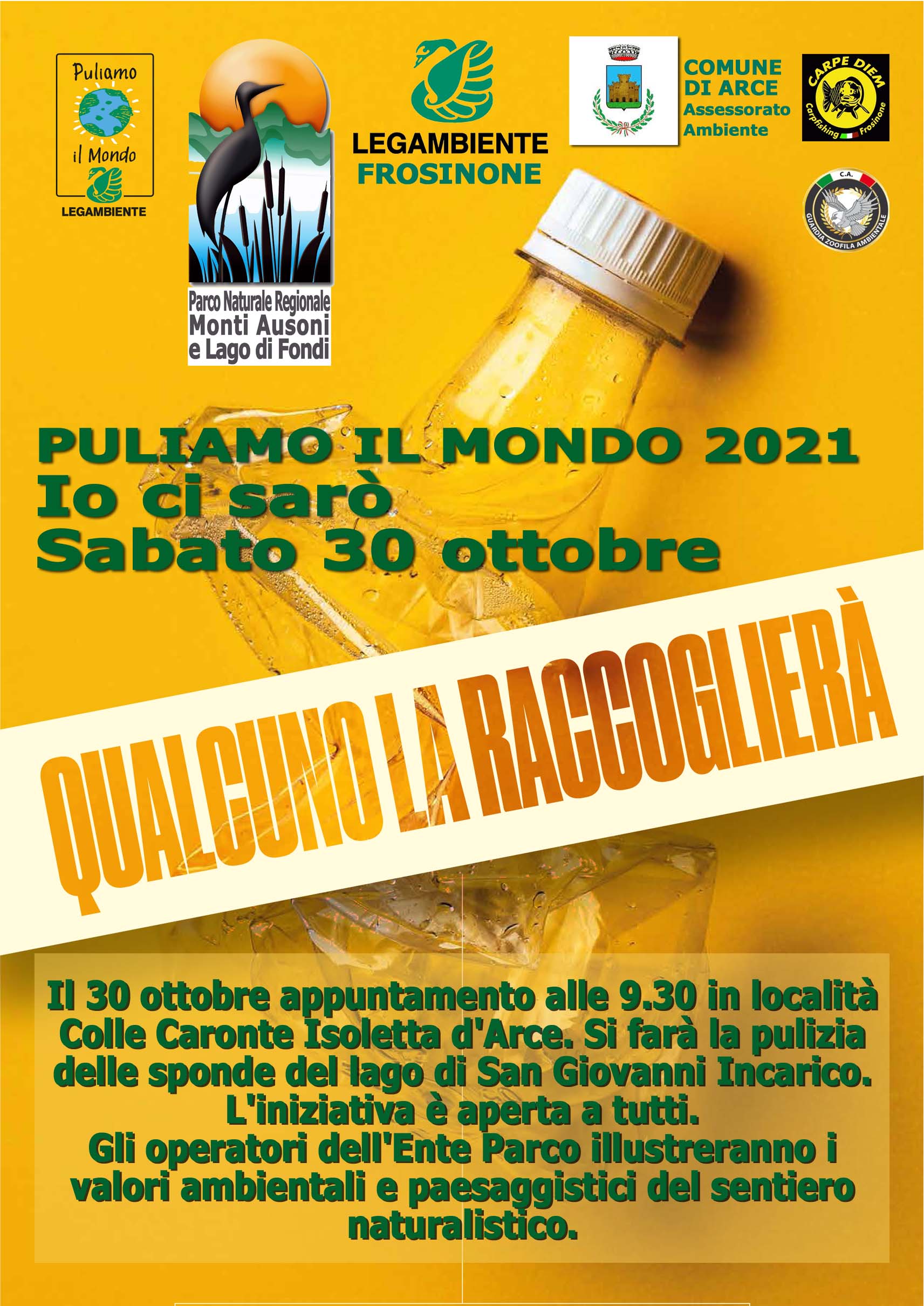 Il Parco Monti Ausoni e Lago di Fondi con il circolo Legambiente Frosinone, in collaborazione con il Comune di Arce assessorato ambiente, l'Associazione Carpe Diem, le Guardie Zoofile Ambientali di Frosinone, cureranno la pulizia delle sponde del lago di San Giovanni Incarico.