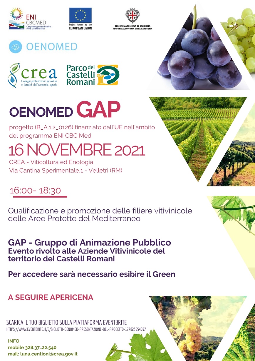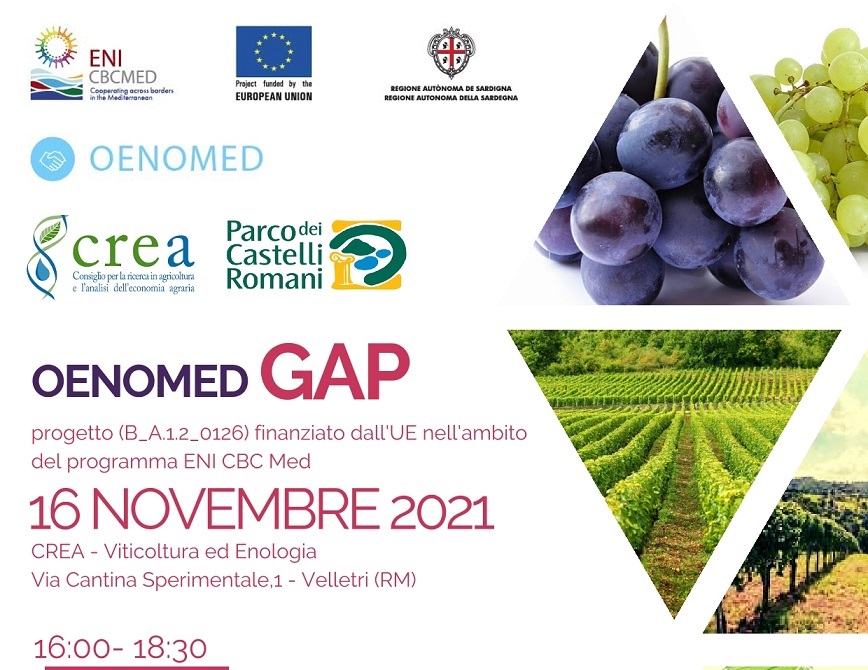 Il 16 novembre 2021 si svolgerà a Velletri il primo GAP del progetto OENOMED, progetto finanziato attraverso il programma europeo di cooperazione transfrontaliera ENI CBC MED e finalizzato alla Qualificazione e promozione delle filiere vitivinicoledelle Aree Protette del Mediterraneo.
