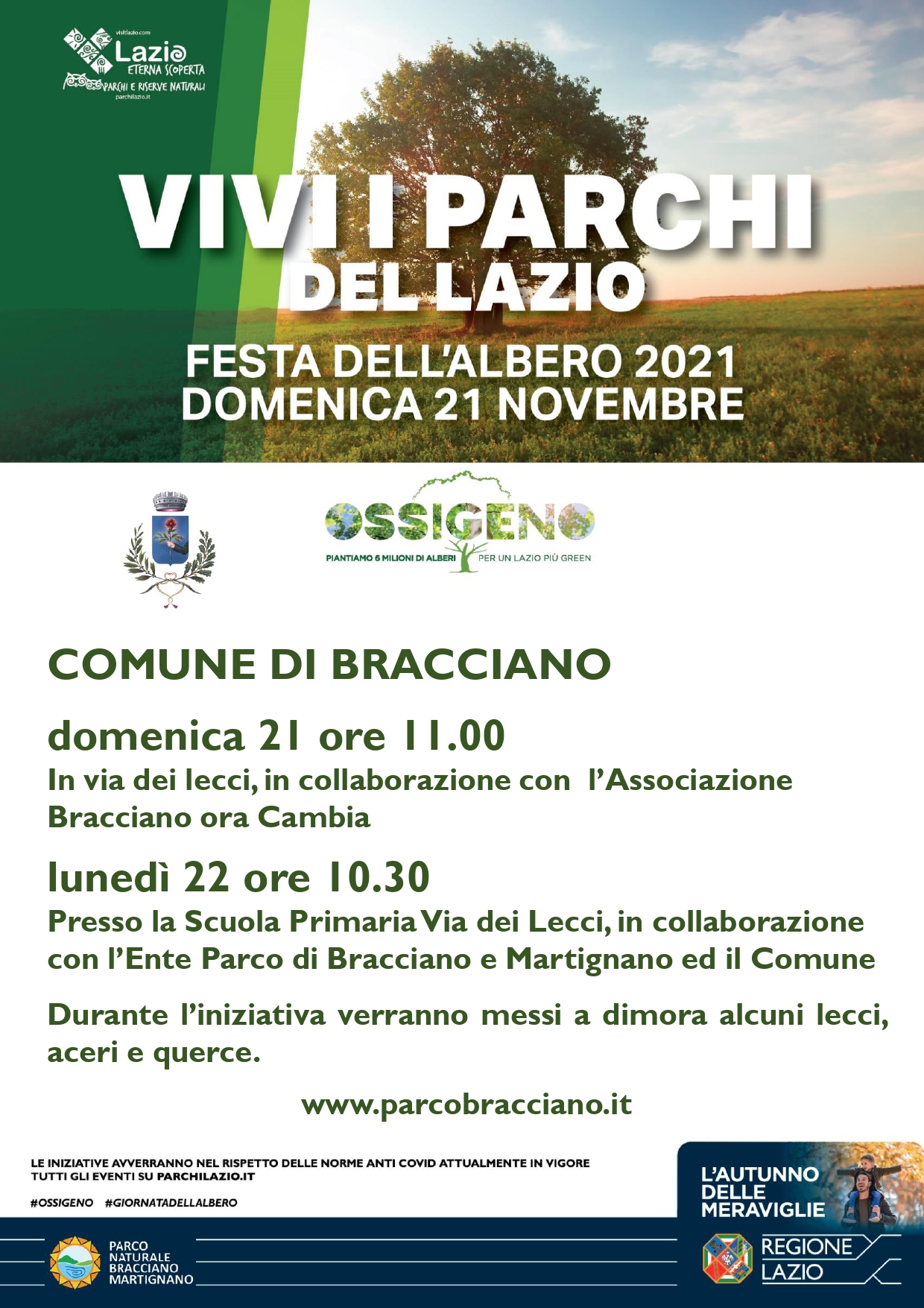 Con il progetto Ossigeno della Regione Lazio, il Parco Naturale Regionale Bracciano Martignano celebra l'edizione 2021 della Giornata Nazionale dell'Albero con due appuntamenti in programma a Bracciano (Roma). L'evento è patrocinato dall'amministrazione comunale braccianese.