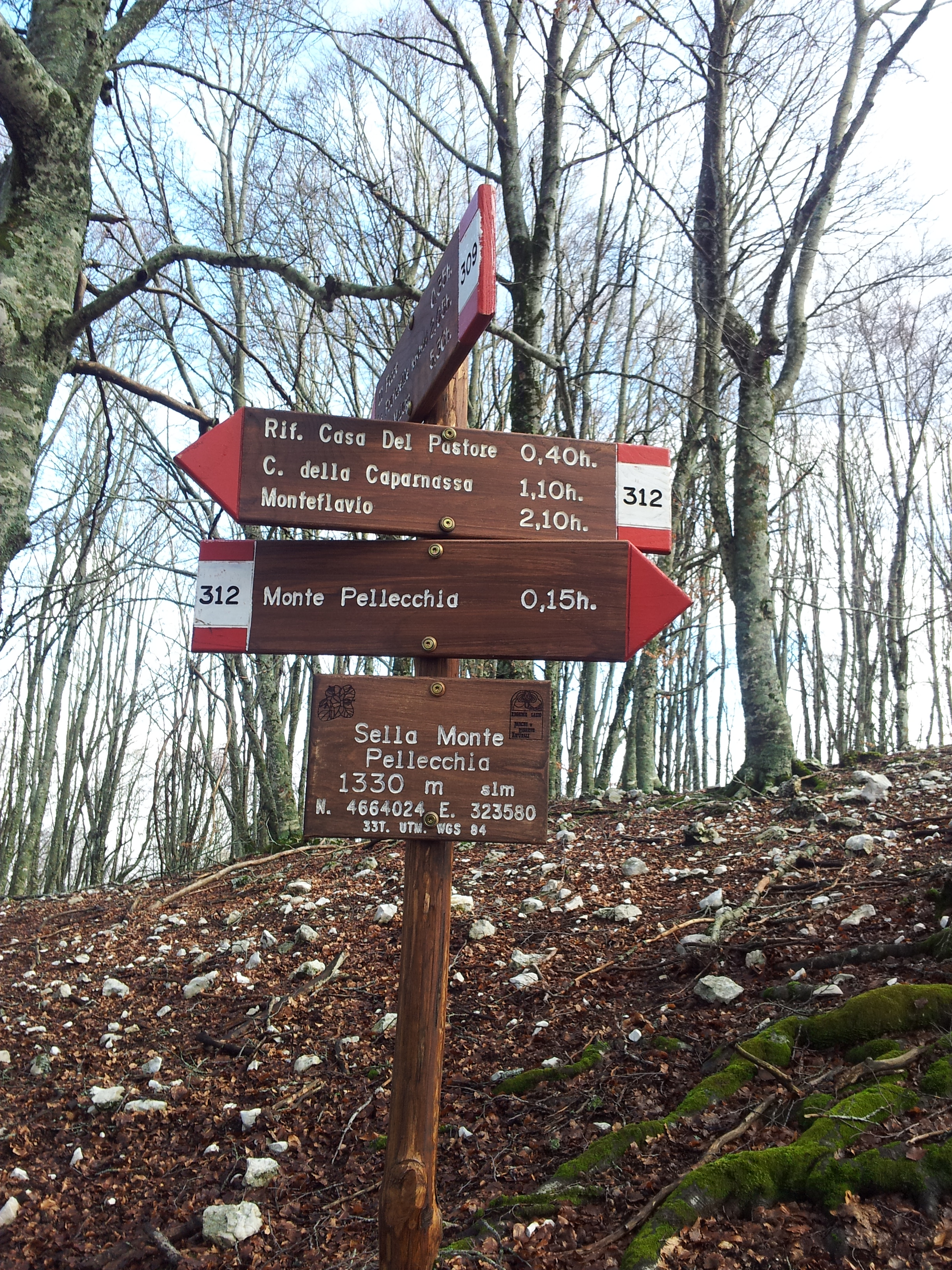 Si parte da Via di Monte Pellecchia, nel piccolo borgo di Monteflavio, proseguendo in leggera salita per questa strada, già indicata con il numero del sentiero (312). L'asfalto lascia presto il posto ad una comoda carrareccia, che si estende fino a raggiungere, dopo circa 15 minuti, i ruderi della cappella della Madonna del Carmine (o delle Carbonere). Poco dopo si incontra un bivio; il sentiero 312 sale a sinistra. Questo tratto si sviluppa sull’antica “Strada della Neve”, percorso fino a metà del XIX secolo dai commercianti della neve. Giunti alla base del Monte Pellecchia si prosegue sul tracciato fino al rifugio della Casa del Pastore dove, svoltando a destra, inizia l’ultimo tratto verso la vetta. Il sentiero si inerpica tra cerri, roverelle e carpini, per poi inoltrarsi in una fitta faggeta. La salita costante non presenta difficoltà degne di nota. Alla fine del bosco si possono scorgere, tra la vegetazione, gli antichi “pozzi della neve”, mentre sulla destra si continua per l’ultimo tratto sotto la cima. Questo, una volta percorso, consente di arrivare su una radura, si scorge la croce di vetta (1370m).