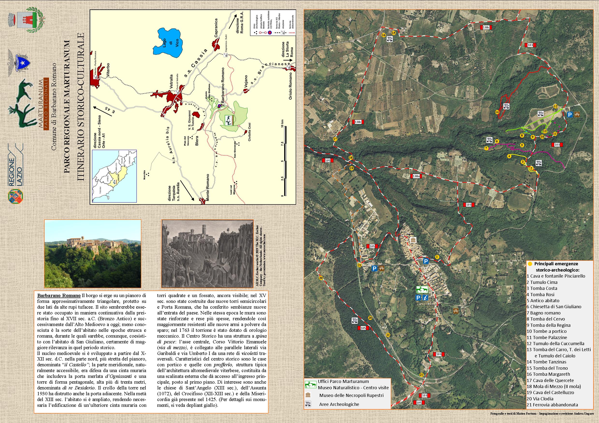 Il pieghevole propone un percorso ad anello, seguendo diversi sentieri esistenti nel parco, per la visita della necropoli etrusca e delle principali emergenze storico-culturali del Parco Marturanum.