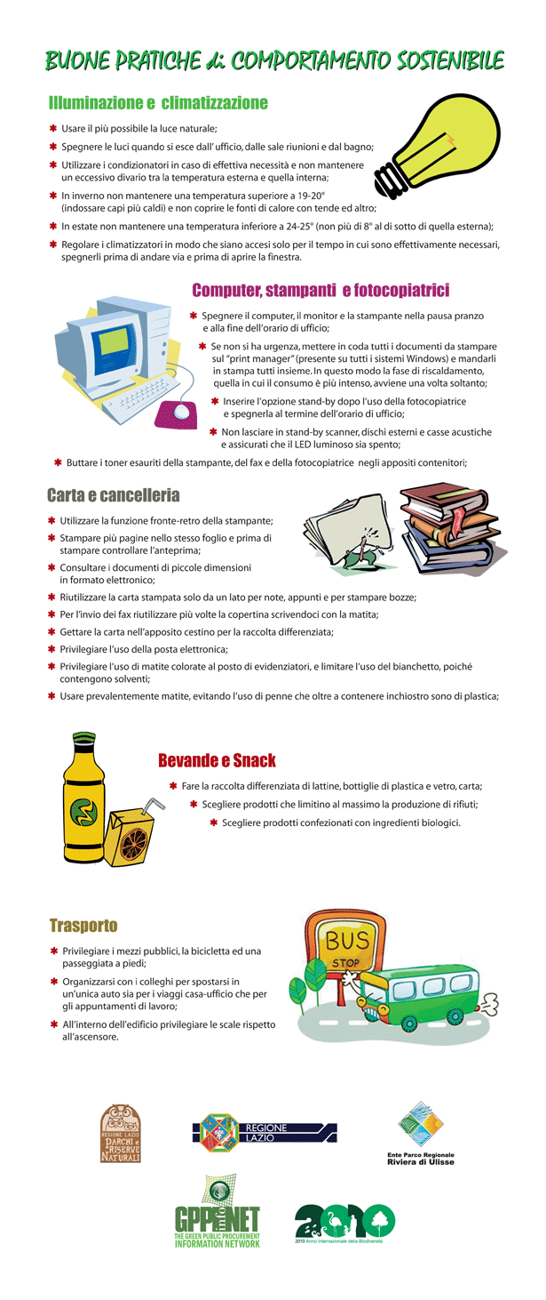 Tali buone pratiche consistono, non soltanto, nell'indicare ai propri dipendenti, comportamenti, nel lavoro quotidiano, rivolti a ridurre consumi o sprechi, ma anche nell'impegno dell'Ente ad orientare la propria politica degli acquisti a criteri ecologici e nella diffusione di una cultura ambientale, tramite il Green Public Procurement (GPP), ponendosi come modello per i cittadini e le imprese.