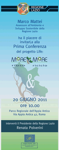 Lunedì 20 giugno 2011 alle ore 10.00 presso la sede del Parco Regionale dell'Appia Antica via Appia Antica, 42 Roma, si svolgerà la prima conferenza del progetto Life: More & More riuso & riciclo - Il riciclo oggi un costo, domani una fonte di guadagno per le nostre imprese e per i nostri cittadini.