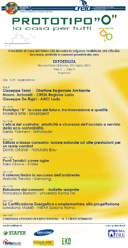 Dal 21 al 24 marzo 2013 si svolgerà a Roma, presso la sede della nuova Fiera di Roma, la Manifestazione ExpoEdilizia, la Fiera Internazionale per l'edilizia e l'architettura sostenibile. Il Coordinamento Creia sarà presente per tutta la durata della manifestazione con uno stand espositivo e informativo e il giorno sabato 23 parteciperà, in collaborazione con l'Università Roma Tre e l'Associazione Azione Sostenibile, al convegno di presentazione del prototipo della "casa del futuro": un'abitazione a ridottissimo consumo energetico - prossimo allo zero - efficiente e sostenibile. A seguire, nella stessa giornata, si svolgerà un workshop (2 crediti formativi)all'interno del quale saranno presentati alcuni degli interventi programmati e realizzati nell'ambito del progetto Parchi rinnovabili per la riduzione degli sprechi, la razionalizzazione dei consumi e l'uso di energie rinnovabili.