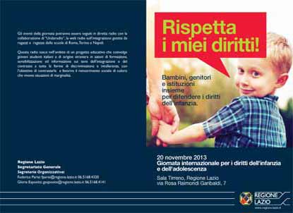 Mercoledì 20 novembre 2013 si celebra la "Giornata internazionale per i diritti dell'infanzia e dell'adolescenza". Per questa occasione, la Regione Lazio organizza una giornata interamente dedicata ai temi dell'infanzia.