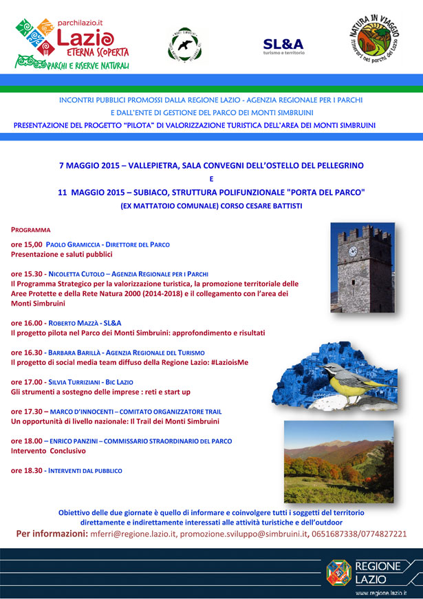 Giovedì 7 maggio a Vallepietra e lunedì 11 maggio a Subiaco, sono previste due giornate di animazione/informazione rivolte a residenti ed operatori locali interessati alla crescita e al miglioramento delle attività turistiche.