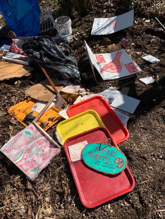 I materiali di scarto provengono dalla ristrutturazione di un locale pubblico, probabilmente una pizzeria, così fanno pensare gli oggetti trovati, come vassoi, cartoni per pizza e similari, un cartello con la scritta “Torno subito”, ma anche secchi di vernice e altri prodotti edili. Sono in corso le indagini per risalire ai responsabili