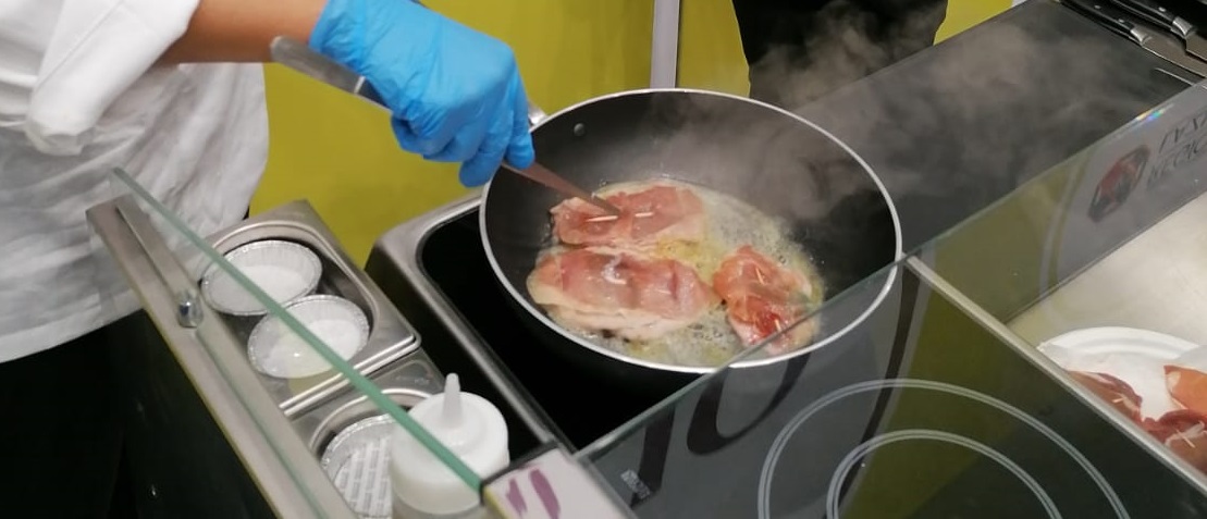 Mettere in padella una noce di burro. Adagiare le fette di prosciutto e le foglie di salvia sopra le fettine infarinando la parte sotto. Appena il burro si scioglie mettere le fettine in padella e lasciar cuocere per 2/3 minuti sfumando con il vino bianco.