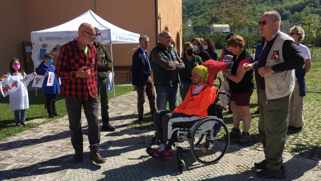 Davanti la sede della Riserva Naturale c’erano il vice sindaco, Antonio Ferri, il quale ha salutato i presenti sostenendo che “Per l'amministrazione comunale di Posta Fibreno, che rappresento, oltre che un onore è un vero piacere che una tappa di questo importante percorso passi proprio per Posta Fibreno e nel territorio protetto con la Riserva Naturale“, il direttore dell’Area Protetta, Antonio Lecce, gli alunni delle scuola primaria e dell’infanzia con i loro insegnanti ad accogliere Matteo ed il gruppo di volontari amici, che lo sostiene ed aiuta nel realizzare i suoi sogni e a seminare forza.