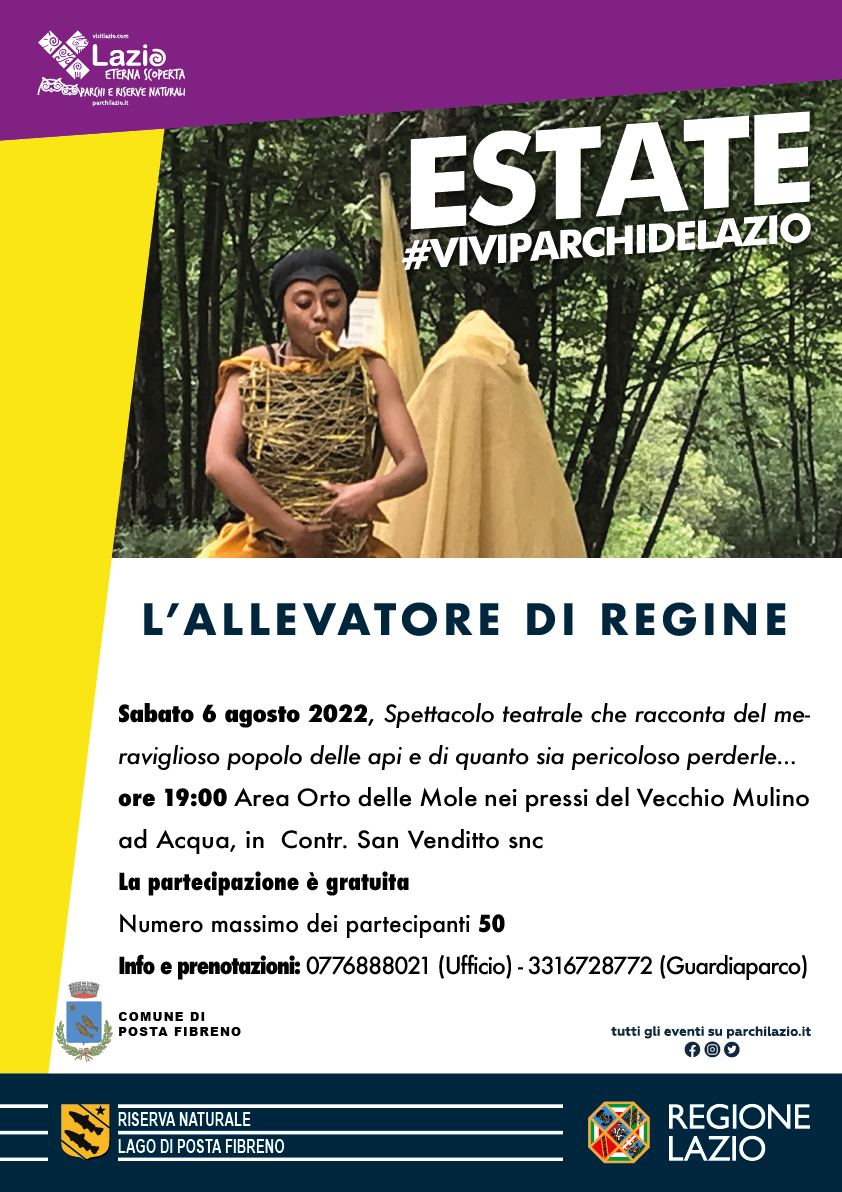 L’appuntamento è alle ore 19:00 presso l’area antistante il Vecchio Mulino ad Acqua, dove la compagnia teatrale “Teatro Lanciavicchio” rappresenterà “L’Allevatore di Regine”, spettacolo teatrale con scenografia naturale che racconta di api, faggete, Alzheimer ma soprattutto di affetto, meraviglia e storie d’amore, come quella di un’ape verso il suo fiore…