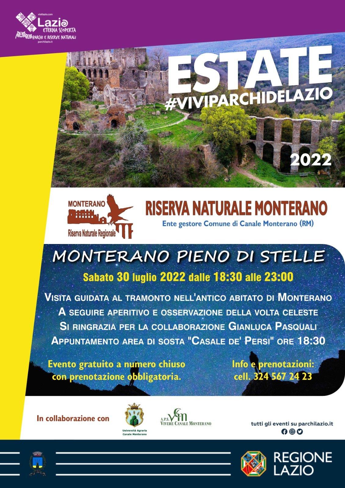 Nella splendida cornice dell’Antico Abitato di Monterano, con un inquinamento luminoso pressoché assente, il secondo evento del calendario estivo della Riserva Naturale propone "Monterano Pieno di stelle". Grazie alla collaborazione dell’A.P.S. VivereCanaleMonterano, visita guidata al tramonto ed a seguire aperitivo e osservazione astronomica della volta celeste. L’evento è gratuito con prenotazione obbligatoria al 324.567.24.23.