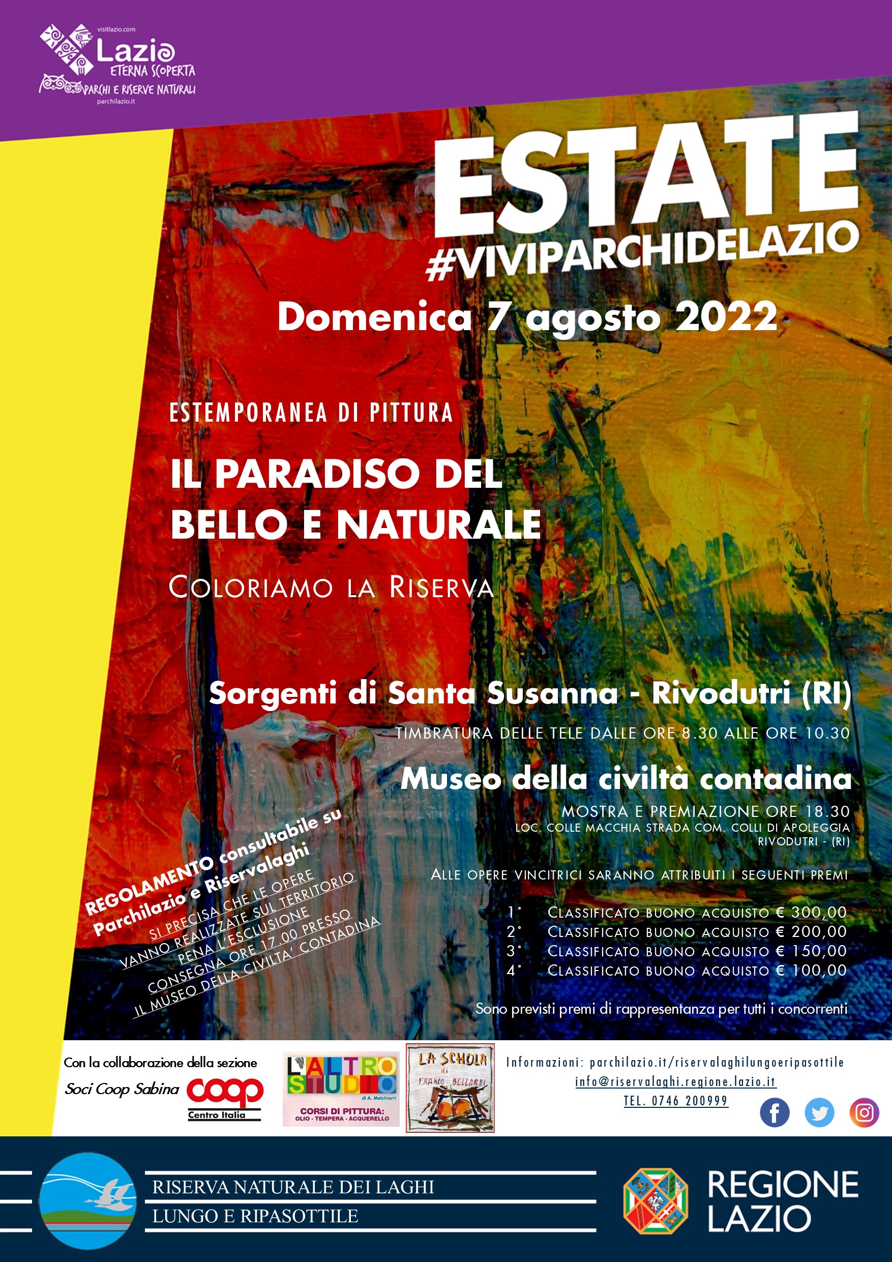La Riserva Naturale dei Laghi Lungo e Ripasottile, con il contributo della Regione Lazio per gli eventi estate 2022 VIVIPARCHIDELAZIO, il patrocinio delle scuole di pittura di Rieti, “L’altro Studio” di Alessandro Melchiorri e “La Schola” di Franco Bellardi e la collaborazione della sezione Soci Coop Sabina, COOP Centro Italia, organizza un’estemporanea di pittura che si svolgerà presso le Sorgenti di Santa Susanna, nel comune di Rivodutri, il 7 agosto 2022 avente come tematica “IL PARADISO DEL BELLO E NATURALE” - Coloriamo la Riserva.