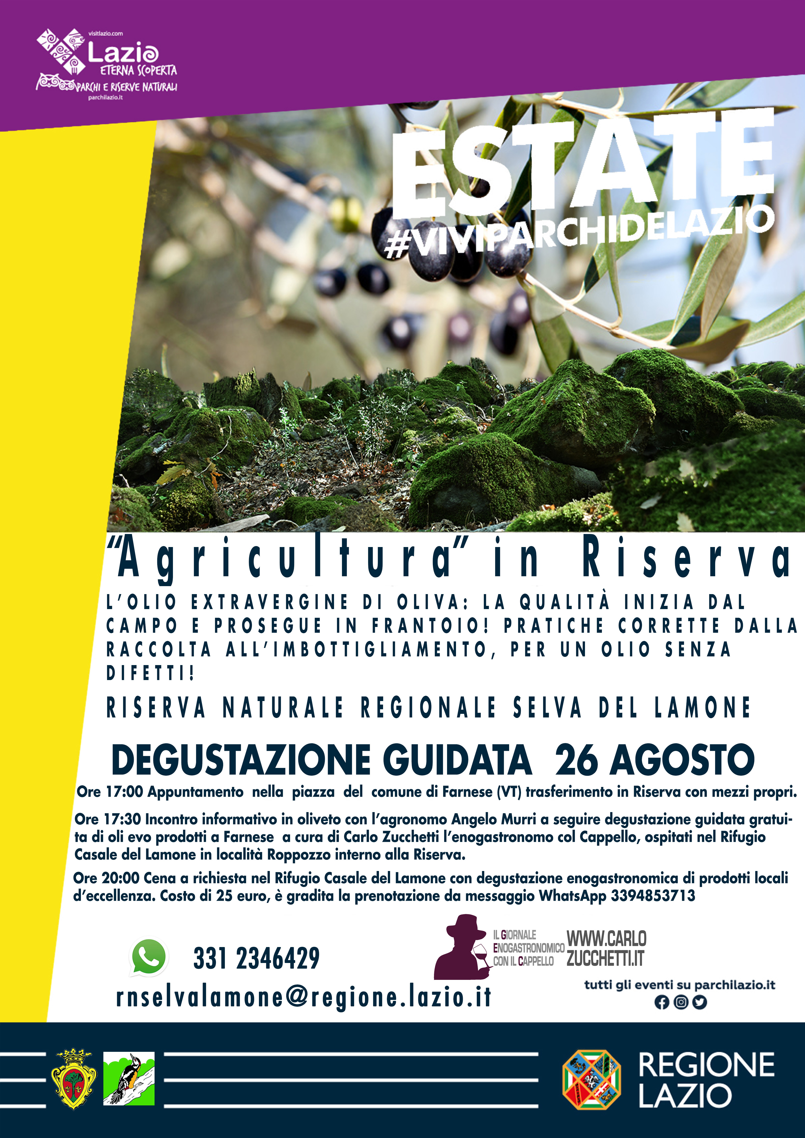 Ore 17:30 Incontro informativo in oliveto con l’agronomo Angelo Murri a seguire degustazione guidata gratuita di oli evo prodotti a Farnese a cura di Carlo Zucchetti l’enogastronomo col Cappello, ospitati nel Rifugio Casale del Lamone in località Roppozzo interno alla Riserva.