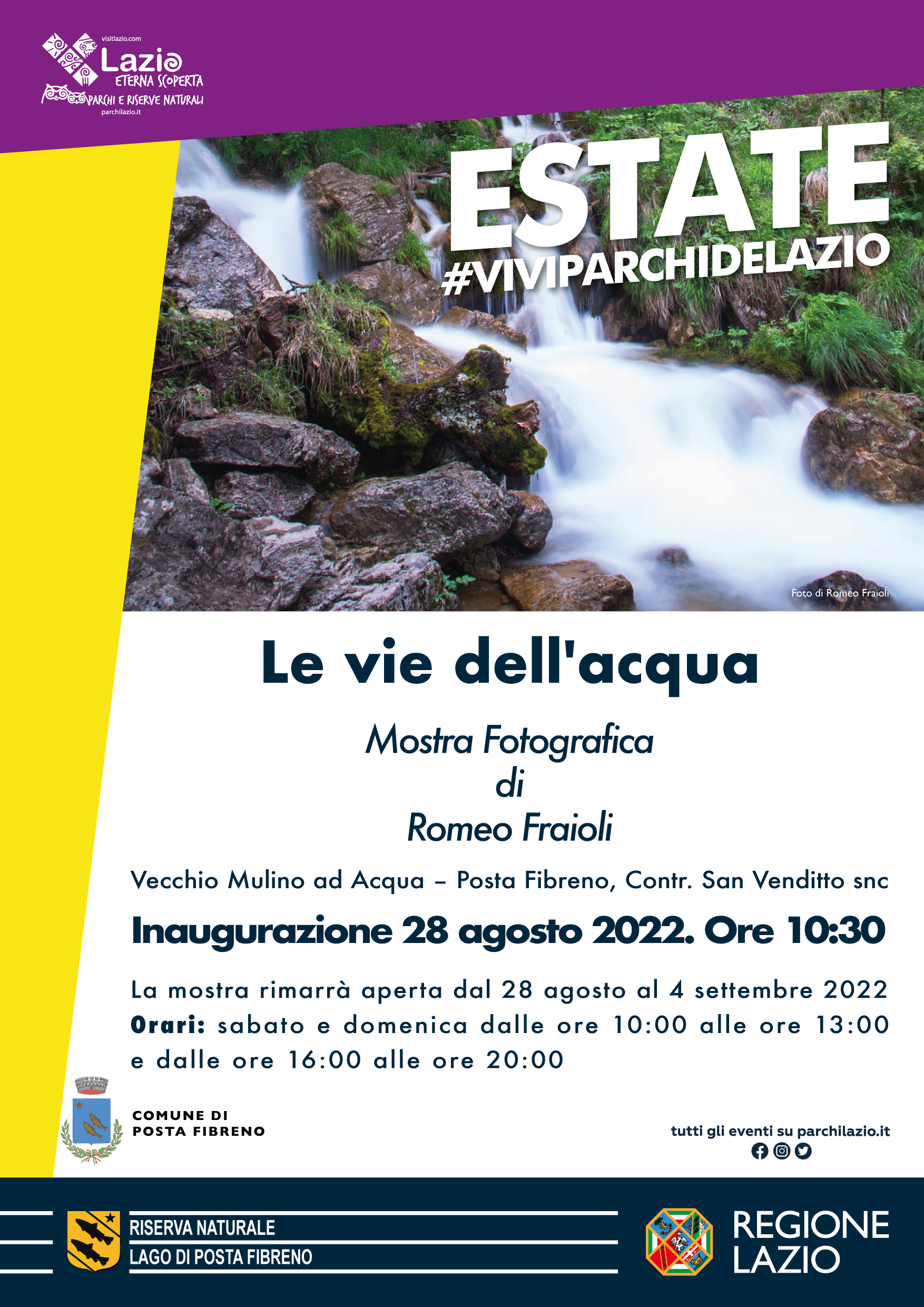 "Chiare, fresche e dolci acque". Decantata da poeti, scrittori e letterati l’acqua è la protagonista assoluta dell'esposizione fotografica dal titolo “Le vie dell’acqua” del fotografo arcese Romeo Fraioli, che si inaugurerà il 28 agosto alle ore 10:30 nel Vecchio Mulino ad Acqua di Posta Fibreno.