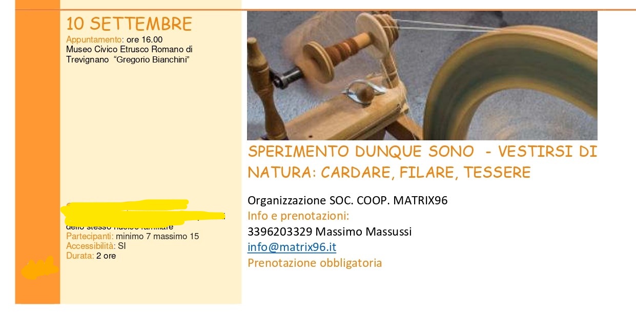 Dal vello della pecora al filo di lana. Fibre, intrecci, colori, fusi, fuseruole, aghi e telai per sperimentare la produzione dei primi tessuti, L'attività di archeologia sperimentale, indirizzata a ragazzi, adulti e famiglie, consentirà di comprendere la produzione di alcuni manufatti tessili a telaio. Durante l'attività verranno eseguite dimostrazioni di cardatura e filatura sperimentale dalla lana ad esempi di tessitura a telaio e a tavolette. L'attività prevederà la realizzazione di una porzione di tessuto da portare a casa. Prevista la viosita al Museo Etrusco-Romano 'Gregorio Bianchini' di Trevignano Romano (Roma).