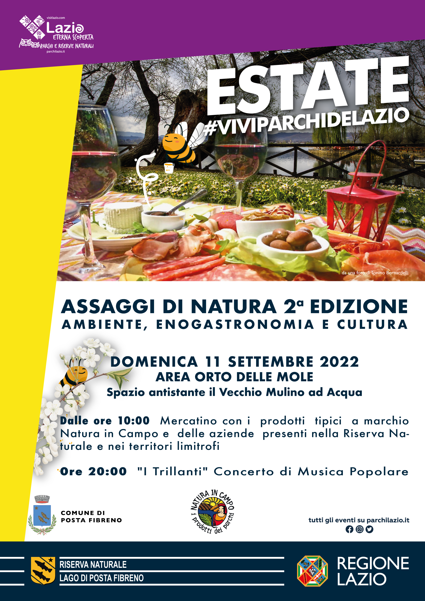 La manifestazione, inserita nella programmazione estiva “Vivi l’estate nella Riserva Naturale 2022” e organizzata nell’ambito degli eventi “Vivi i Parchi del Lazio” della Regione Lazio, ha l’obiettivo prioritario di valorizzare i prodotti enogastronomici non solo delle aziende aderenti al marchio Natura in Campo presenti nei Parchi e nelle Riserve Naturali del Lazio ma anche di quelle ricadenti nel territorio limitrofo all’Area Protetta che producono eccellenze che meritano di essere conosciute e valorizzate.