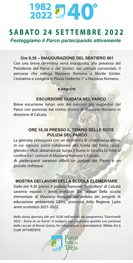 - La giornata proseguirà con un momento di cittadinanza attiva, in cui ognuno potrà collaborare alla tutela del Parco raccogliendo i rifiuti abbandonati lungo il fiume in località Le Rote al confine tra i Comuni di Mazzano Romano e Calcata. Ai partecipanti saranno offerti un gadget del Parco e un piccolo rinfresco.