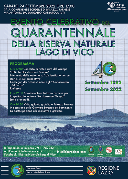 In occasione dei quaranta anni dalla istituzione dell'area protetta si terrà a Caprarola, Sabato 24 Settembre alle ore 17.00, un evento celebrativo alla presenza delle Autorità Regionali, Provinciali e dei Comuni facenti parte della Comunità del Parco.