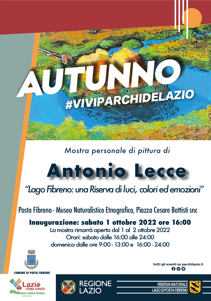 Si inaugura sabato 1 ottobre alle ore 16:00, presso il Museo Naturalistico Etnografico della Riserva Naturale lago di Posta Fibreno, la mostra “Lago Fibreno: una Riserva di luci, colori ed emozioni" del pittore postese Antonio Lecce.