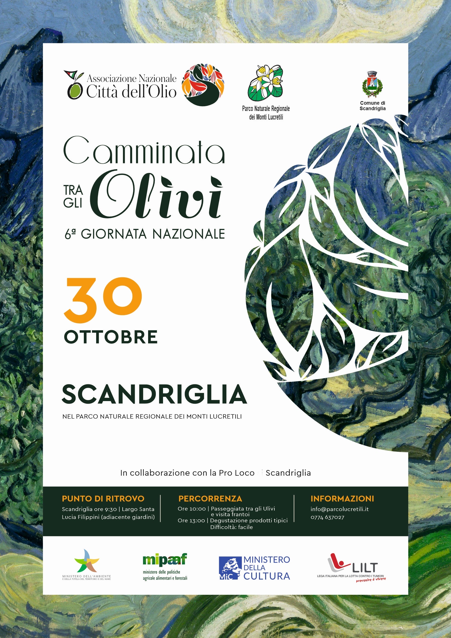 Il Parco Naturale Regionale dei Monti Lucretili ha organizzato per domenica 30 ottobre una passeggiata tra gli Olivi nel Comune di Scandriglia con la collaborazione della locale Pro Loco nell’ambito della 6° Giornata Nazionale. Il Parco è infatti associato alla Associazione Città dell’Olio promotore delle varie iniziative di valorizzazione del Paesaggio dell’Olivo e dei suoi prodotti. Alla passeggiata seguiranno una suggestiva visita dei frantoi in piena attività e una merenda con i prodotti tipici locali. L’appuntamento è previsto alle ore 9,30 presso Largo Santa Lucia Filippini a Scandriglia. E’ una bella occasione per entrare in contatto con la natura attraverso la magia delle olivete.