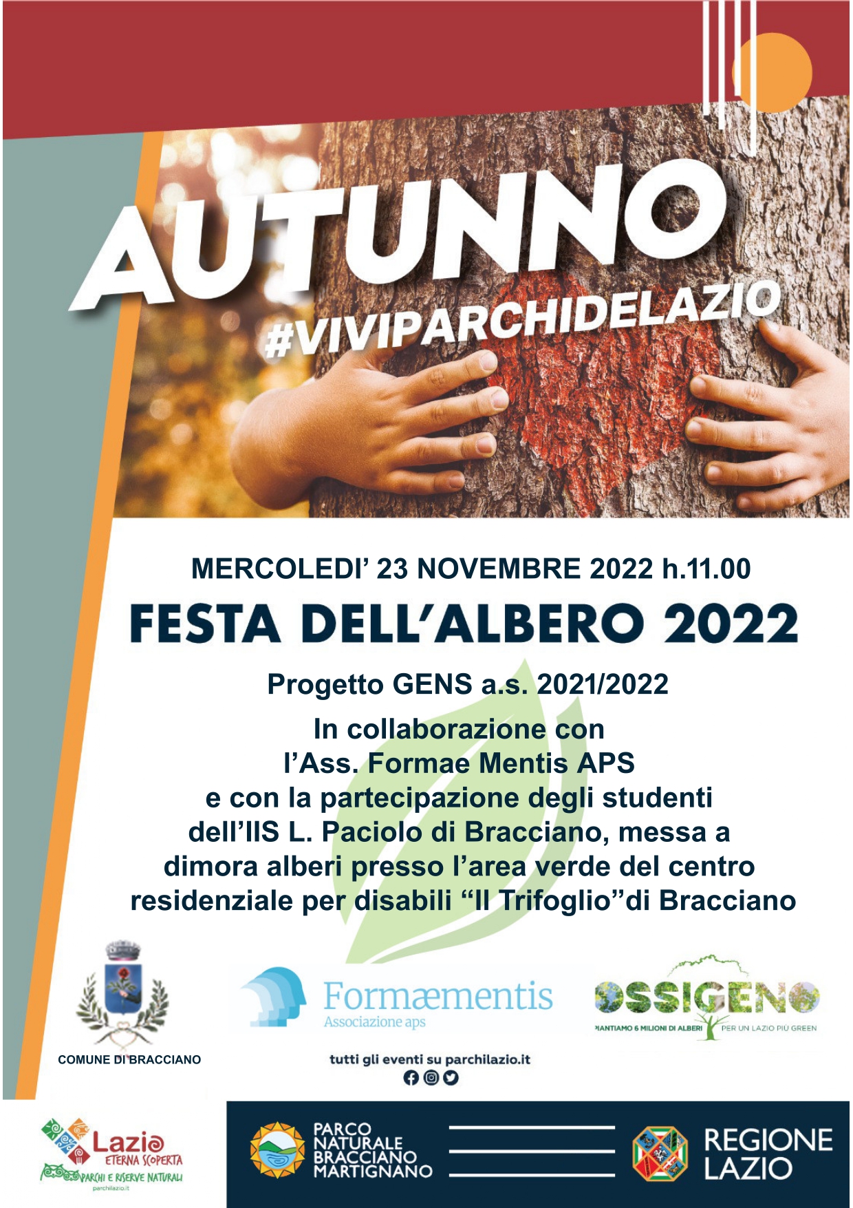 Il Parco Naturale Regionale Bracciano Martignano, alla presenza dell'amministrazione comunale e in collaborazione con l'associazione culturale Formae Mentis, celebra l'evento a Bracciano (Roma) MERCOLEDì 23 NOVREMBRE alle ore 11 con la messa a dimora di nuovi alberi presso l'area verde del centro per disabili 'Il Trifoglio'.