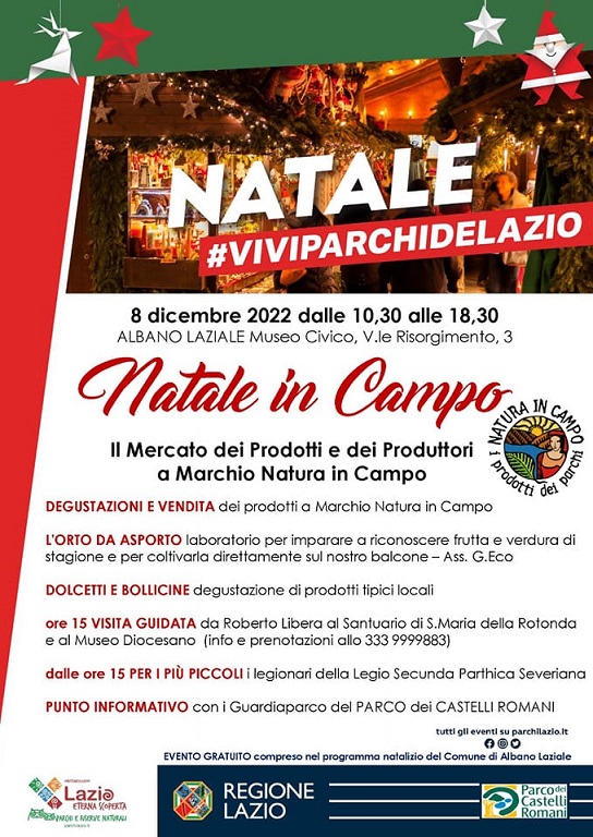Vi aspettiamo l'8 dicembre 2022 dalle 10:30 alle 18:30 ad Albano Laziale, Museo Civico, V.le Risorgimento 3, per il primo dei mercati Natalizi dei prodotti e dei produttori a marchio regionale "Natura in Campo", che garantisce la filiera delle produzioni agro-alimentari sostenibili e tradizionali provenienti dai territori delle aree naturali protette, finalizzato alla promozione e valorizzazione delle tradizioni locali.