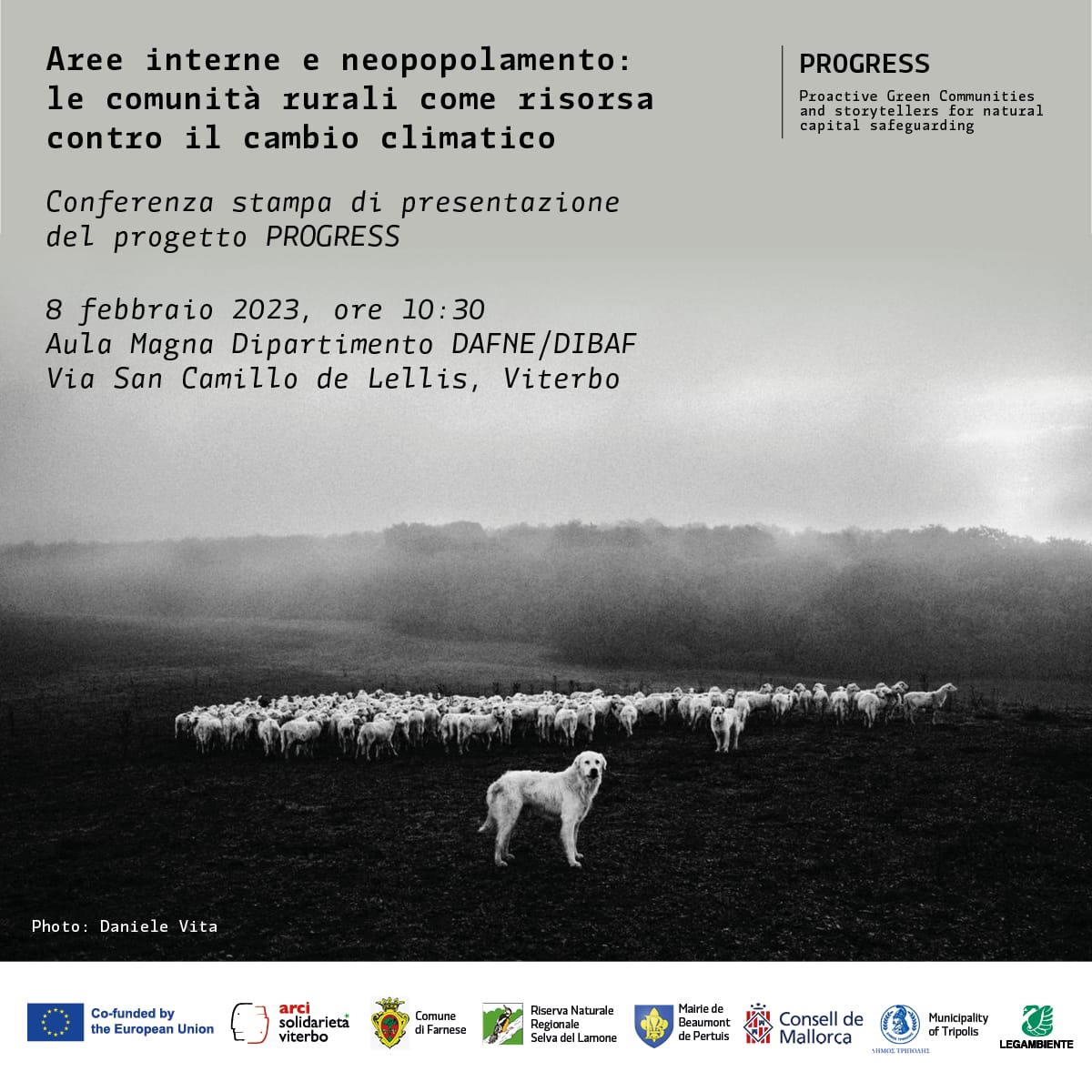 8 febbraio 2023 0re 10:30 presentazione #ProgettoProgress (Proactive Green Communities and storyteller for Natural Capital Safeguarding) cofinanziato dalla Commissione europea. Il progetto come obiettivo finale dovrà giungere a proporre soluzioni in materia ambientale e di cambio climatico ai differenti (nelle diverse nazioni) policy makers costruendo in tal senso anche una comunità europea unita e attenta alle tematiche tremendamente attuali. Aula agna Dipartimento DSFNE/DIBAF via San Camillo de Lellis, Viterbo