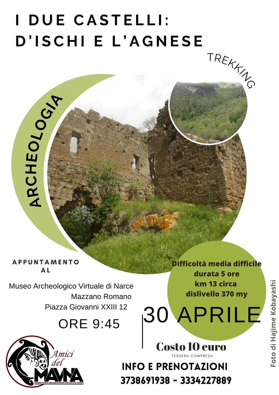 La visita guidata di domenica si svolgerà presso il MAVNA, il Museo Archeologico di Mazzano, dove sono custoditi alcuni dei reperti falisci ritrovati presso il tempio di Monte Li Santi - Le Rote. Dopo l’appuntamento e la visita guidata al museo, si raggiungerà in automobile privata la località dell’Agnese; qui si visiteranno i resti dell’insediamento medievale per poi prendere il sentiero 023 che scende nella valle del Treja. Percorrendo la valle verso ovest ed attraversando il torrente Cerreto si raggiungerà Castel d’Ischia, dove si consumerà il pranzo al sacco. Dopo la visita si scenderà a valle percorrendo le tagliate meridionali e si ritornerà all’Agnese.