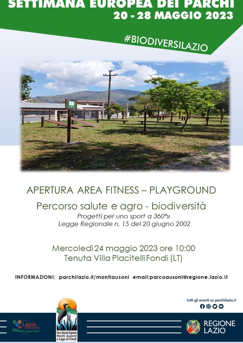 Prevista per il 24 maggio 2023 alle ore 10:00 la presentazione al pubblico della nuova Area Fitness-Playground presso la Tenuta Villa Placitelli in Fondi(LT), di proprietà della Regione Lazio e affidata in gestione all'Ente Parco.