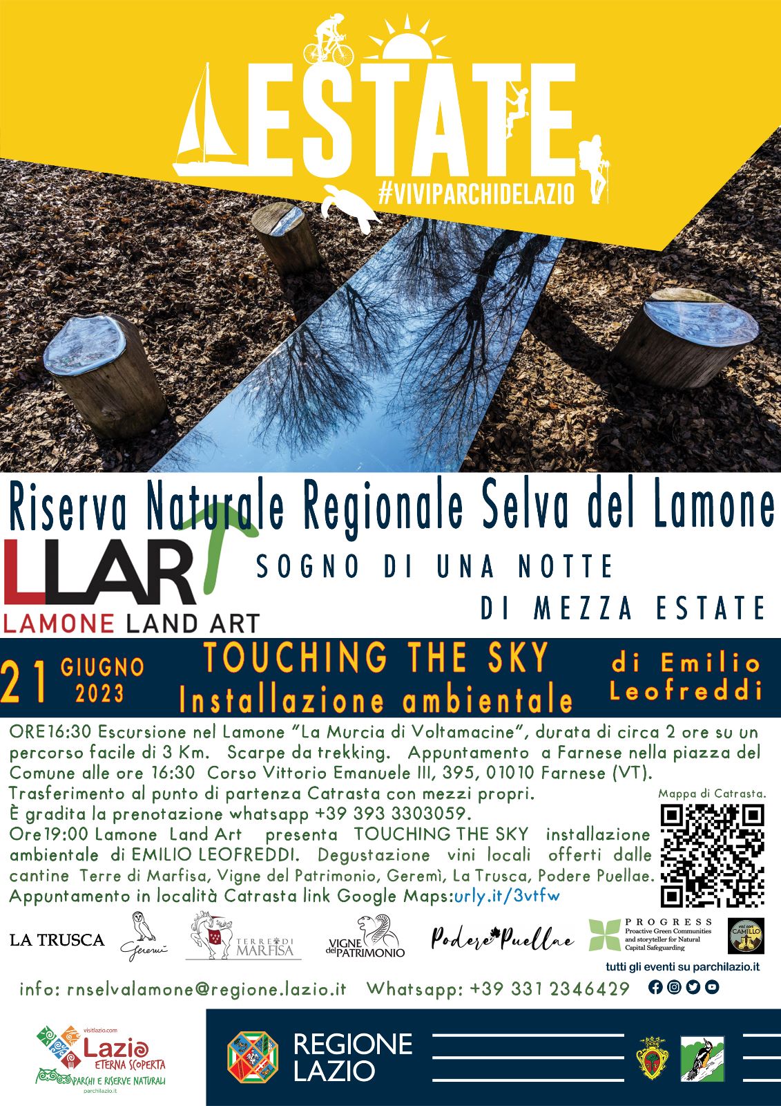 Ore19:00 Lamone Land Art presentazione a cura di Mara van Wees dell’installazione ambientale #TouchingTheSky di Emilio Leofreddi. Degustazione di vini del territorio offerta dalle cantine Terre di Marfisa, Vigne del Patrimonio, Geremivini, La Trusca, Podere Puellae . Appuntamento in località Catrasta link Google Maps: urly.it/3vtfw