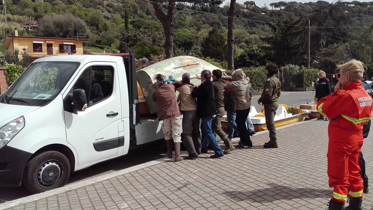 Sono in corso le operazioni di recupero delle barche abbandonate sull’arenile del lago Albano di Castel Gandolfo (RM).