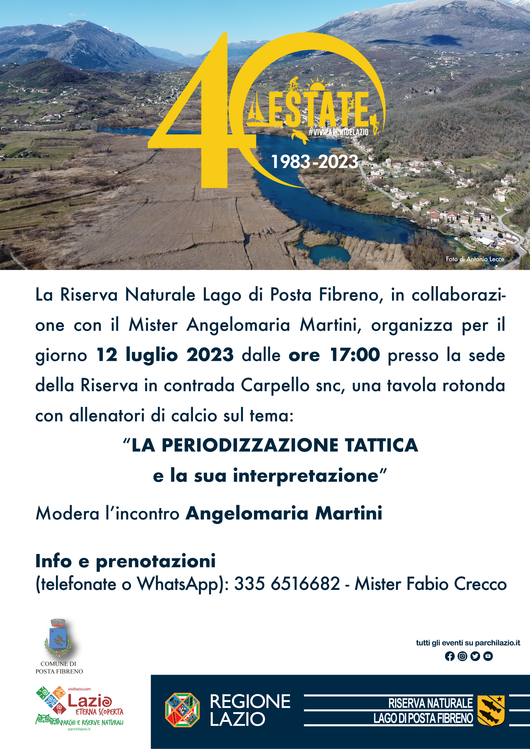 La Riserva Naturale Lago di Posta Fibreno, in collaborazione con il Mister Angelomaria Martini, ha organizzato per mercoledì 12 luglio 2023 una tavola rotonda con allenatori di calcio sul tema “La Periodizzazione Tattica e la sua interpretazione”, che si terrà presso la sede della Riserva, in Contrada Carpello snc, alle ore 17:00.