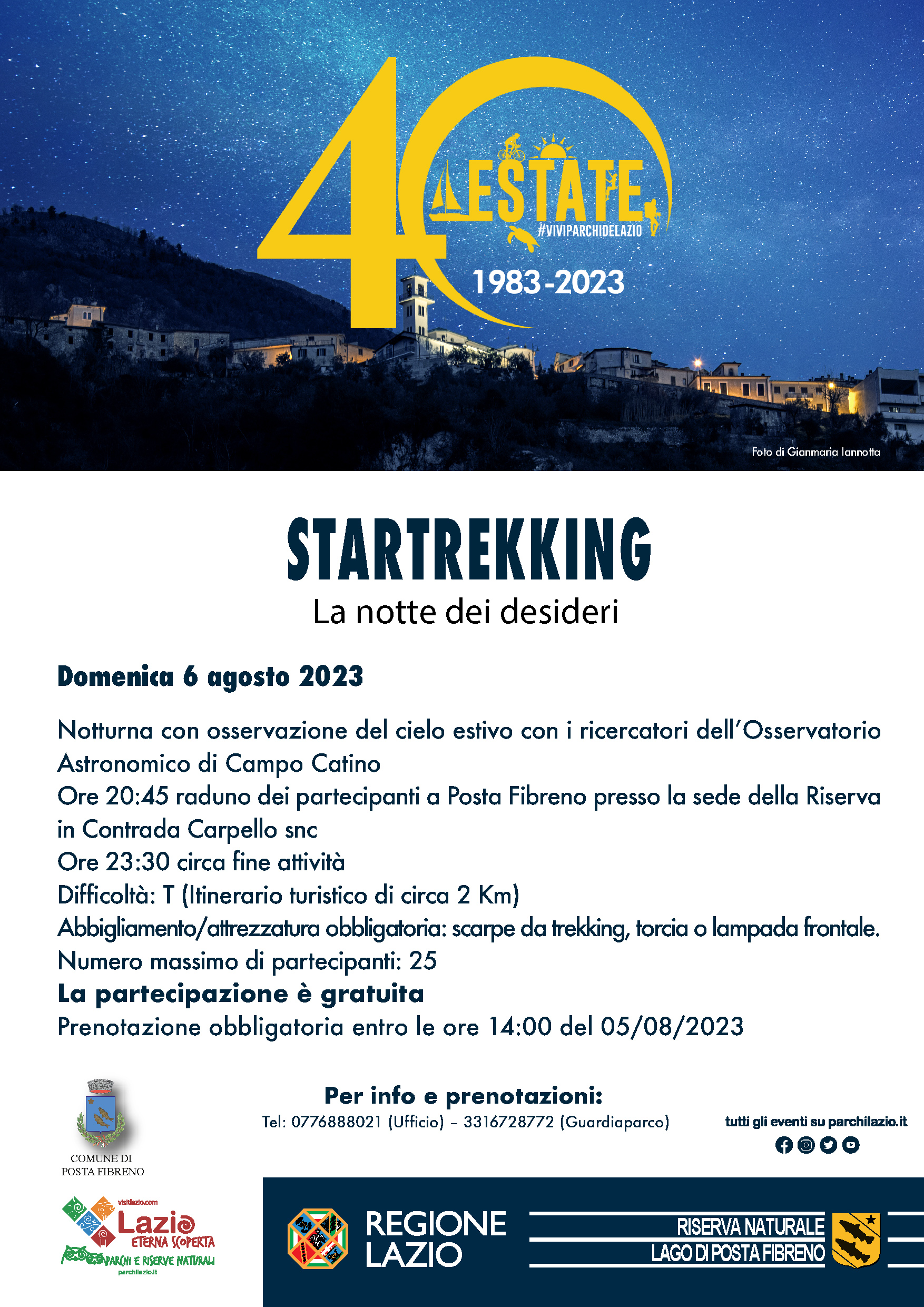 Domenica 6 agosto 2023 “StarTrekking - La notte dei desideri”, notturna con osservazione del cielo estivo.