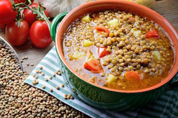 fate un soffritto in olio di oliva con aglio, cipolla, carote, patata e i pomodori passati. Lasciate insaporire per qualche minuto, quindi aggiungete alcune foglie di sedano tagliate a pezzi, acqua calda (o brodo vegetale) e, a piacere, sale e peperoncino. Aggiungete le lenticchie e fate bollire a fuoco medio per circa un’ora rimestando di tanto in tanto. Disponete le fette di pane “bruscato” nella zuppiera, versate la zuppa e irrorate con olio extra vergine d’oliva. Lasciate riposare prima di servire.