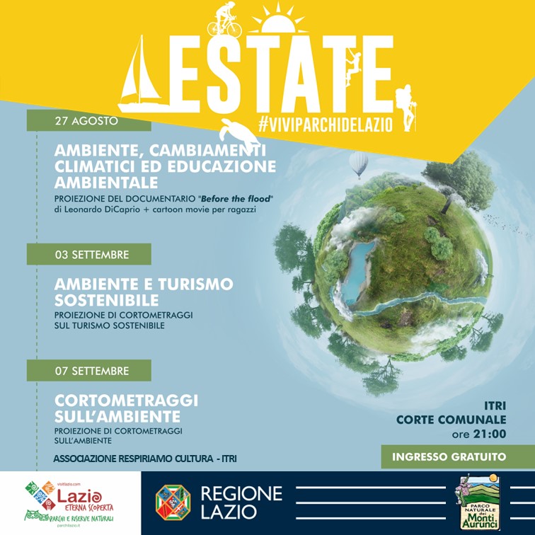 Si parte domenica 27 Agosto alle ore 21 con AMBIENTE, CAMBIAMENTI CLIMATICI ED EDUCAZIONE AMBIENTALE. Interverranno il direttore del Parco Monti Aurunci dott. Giorgio De Marchis, il dott. Simone Di Biasio ricercatore presso l'Università di Roma Tre ed il Giornalista Andrea Brengola. Seguirà la proiezione del documentario "Before the Flood" di Leonardo Di Caprio.