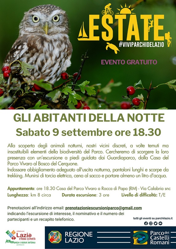Appuntamento sabato 9 settembre alle ore 18:30 con l'escursione gratuita a cura dei Guardiaparco, che ci guideranno alla scoperta degli animali notturni. Cercheremo di scorgere la loro presenza, attraverso una visita guidata dalla Casa del Parco del Vivaro al Bosco del Cerquone. Tutte le info nella locandina allegata.