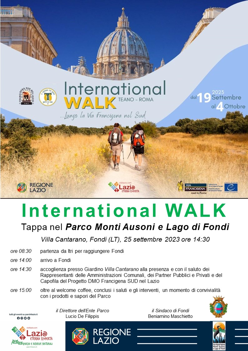 Lunedì 25 settembre, nei giardini di Villa Cantarano, l’Ente Parco Naturale Regionale Monti Ausoni e Lago di Fondi, in sinergia con il Comune di Fondi, accoglierà ufficialmente, al loro arrivo a Fondi, il folto gruppo di pellegrini provenienti da varie parti del mondo che, partiti da Teano e diretti a Roma, partecipano all’International Walk 2023 lungo il percorso dell’antica via Francigena.