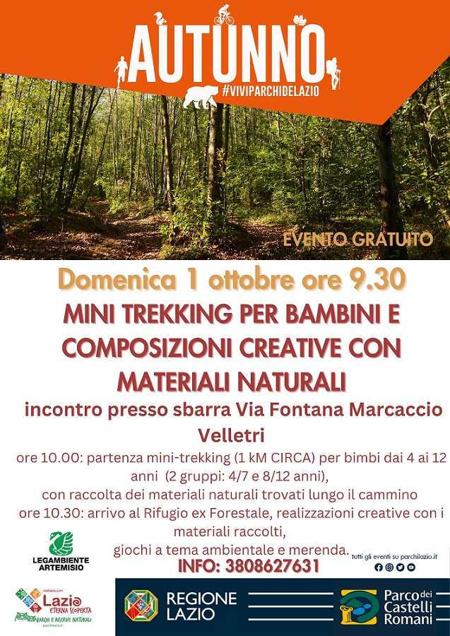 Appuntamento domenica 1 ottobre alle ore 9:30, presso via Fontana Marcaccio a Velletri (RM), con il "Mini trekking per bambini e composizioni creative con materiali naturali".