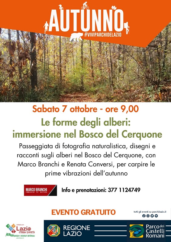 Appuntamento sabato 7 ottobre alle ore 9:00, con l'evento gratuito "Le forme degli alberi: immersione nel Bosco del Cerquone", a cura di Marco Branchi e Renata Conversi. Una passeggiata di fotografia naturalistica, disegni e racconti sugli alberi nel bosco del Cerquone, per carpire le prime vibrazioni dell'autunno.