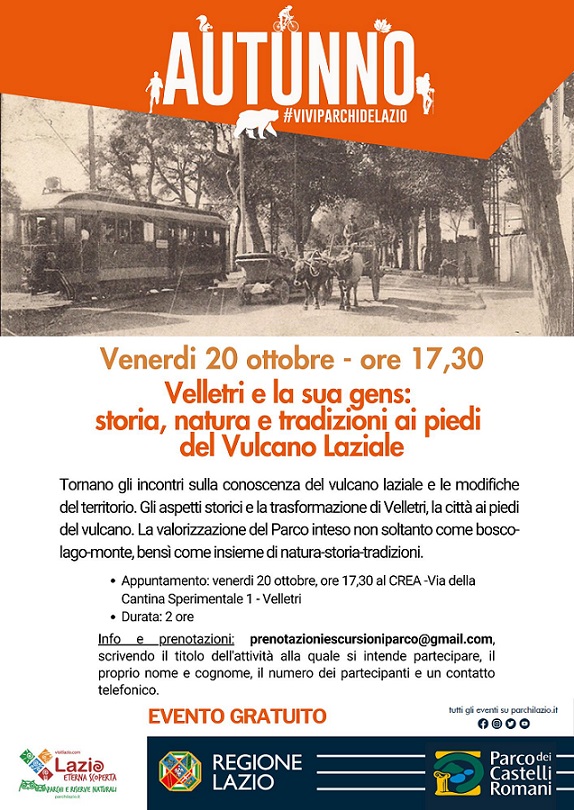 Venerdì 20 ottobre alle 17:30, presso il CREA di Velletri (RM), un incontro a cura dei Guardiaparco del ciclo "Velletri e la sua gens: storia, natura e tradizioni ai piedi del Vulcano Laziale"