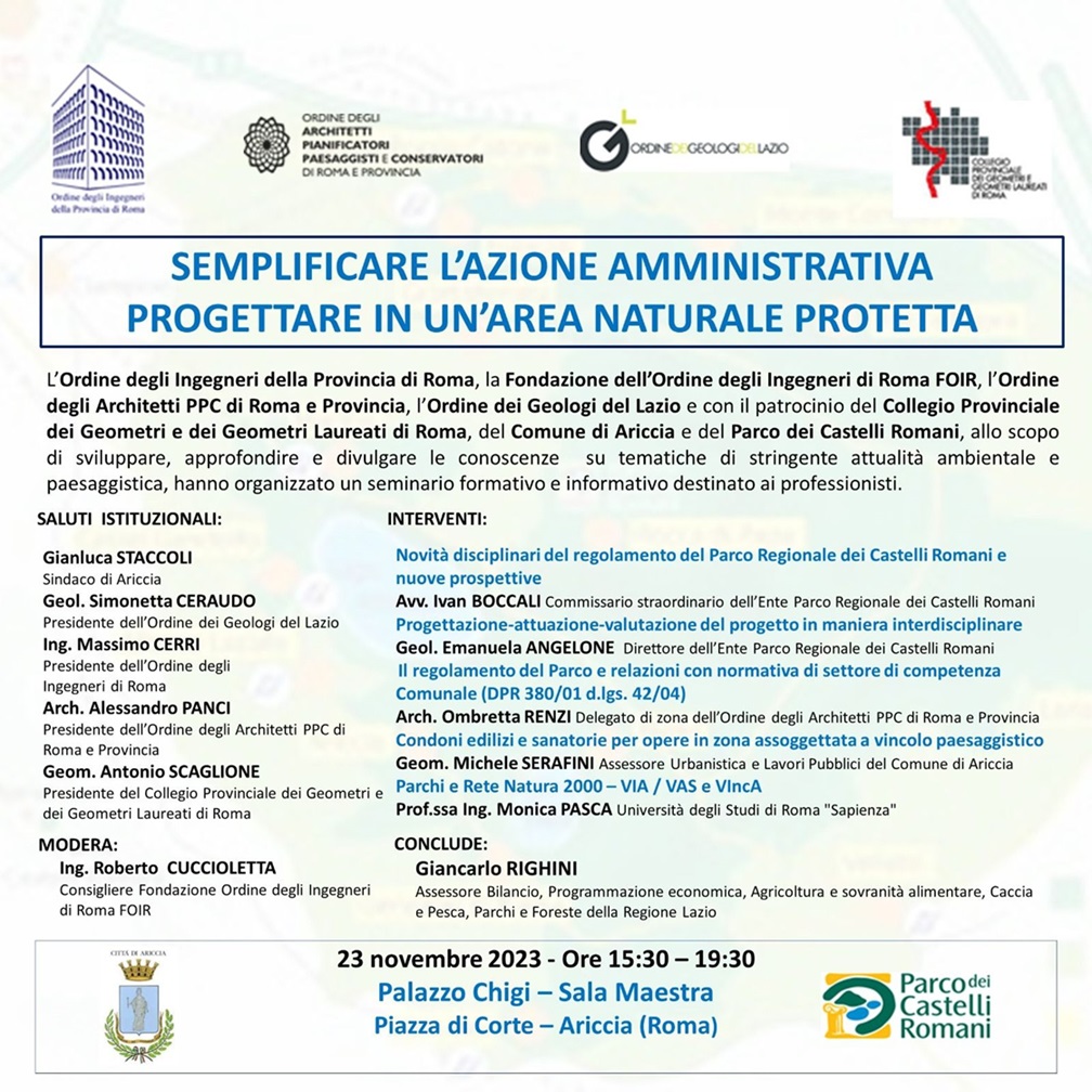 Giovedì 23 novembre dalle ore 15:30 alle 19:30, si svolgerà presso la Sala Maestra di Palazzo Chigi ad Ariccia (RM), il seminario formativo e informativo "Semplificare l'azione amministrativa - progettare in nun'area naturale protetta", organizzato dall'Ordine degli Ingegneri della Provincia di Roma e la Fondazione dell’Ordine degli Ingegneri di Roma FOIR, in collaborazione con l’Ordine degli Architetti PPC di Roma e Provincia, con l’Ordine dei Geologi del Lazio, con il patrocinio e la partecipazione del Parco regionale dei Castelli Romani.