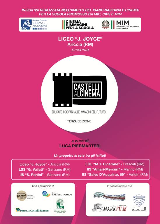 Il progetto, al quale hanno partecipato diversi istituti scolastici dell’area castellana con capofila il ‘Liceo James Joyce’ di Ariccia, rientra nell’ambito del bando 2022, “Il linguaggio cinematografico e audiovisivo come oggetto e strumento di educazione e formazione”, inserito nel contesto del programma “Scuole per il Cinema”, finanziato dal Ministero della Cultura e dal Ministero dell’Istruzione.