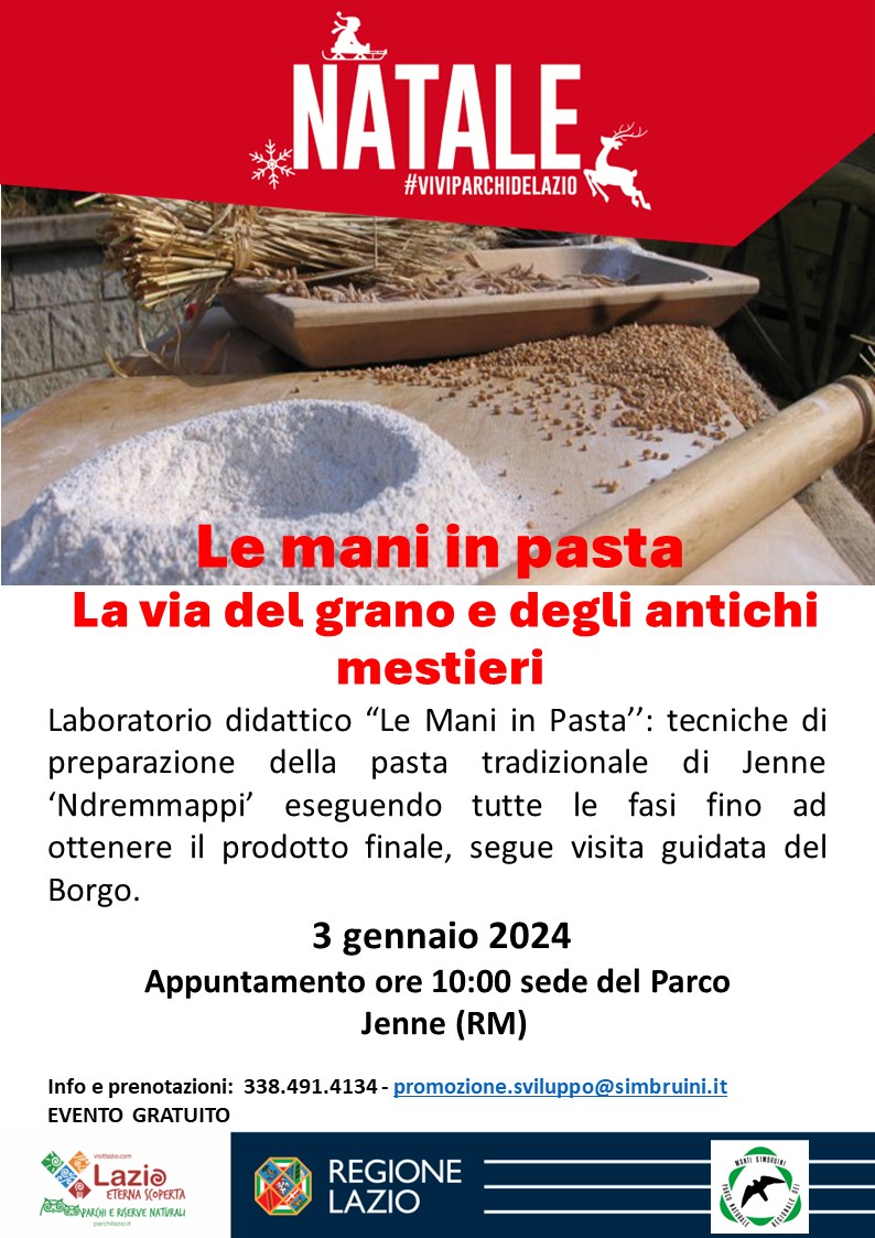 Laboratorio didattico “Le Mani in Pasta’’: tecniche di preparazione della pasta tradizionale di Jenne ‘Ndremmappi’ eseguendo tutte le fasi fino ad ottenere il prodotto finale, segue visita guidata del Borgo.