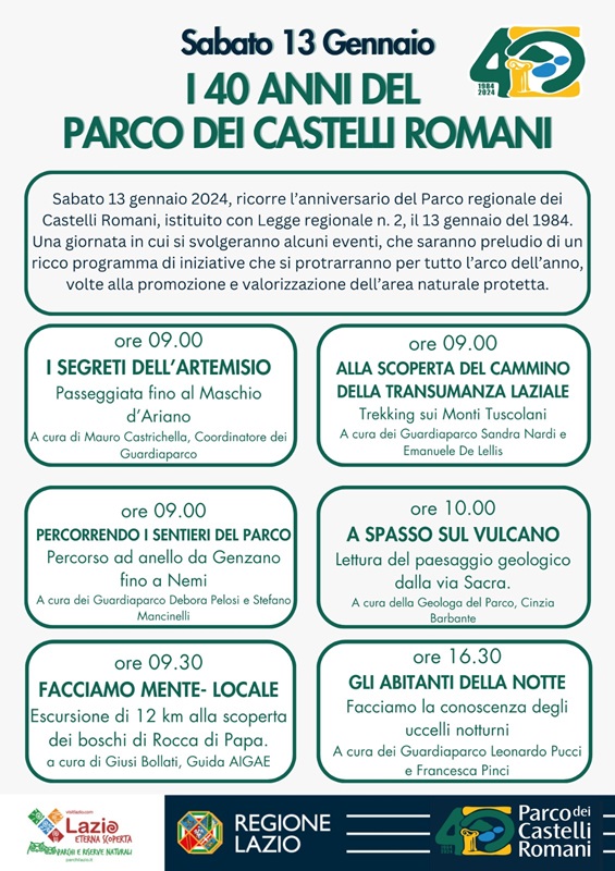 Sabato 13 gennaio 2024, per celebrare i 40 anni dall’istituzione del Parco regionale dei Castelli Romani, si svolgeranno alcuni eventi, che saranno preludio di un ricco programma di iniziative che si protrarranno per tutto l’arco dell’anno, volte alla promozione e valorizzazione dell’area naturale protetta.