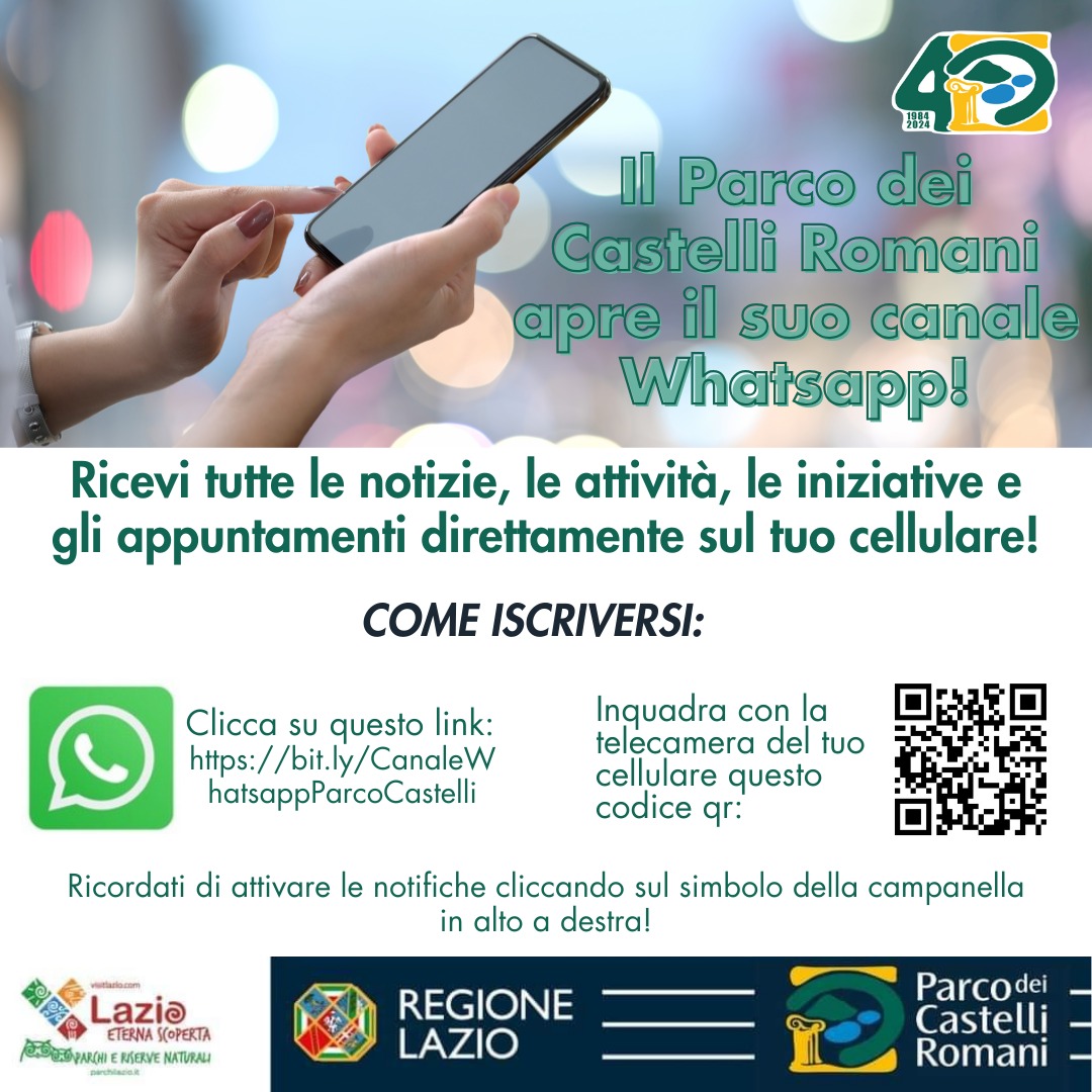 Il Parco dei Castelli Romani attiva il proprio canale su WhatsApp, uno strumento di comunicazione per aggiornare su attività, appuntamenti in programma e novità, direttamente sul proprio cellulare.