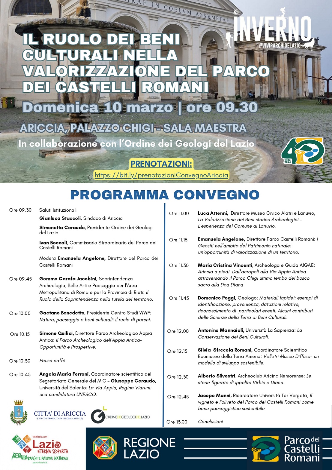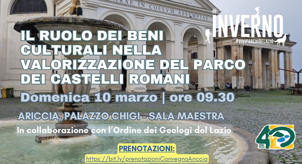 Domenica 10 marzo alle ore 9:30, presso la Sala Maestra di Palazzo Chigi, si svolgerà il convegno: "Il ruolo dei Beni Culturali nella valorizzazione del Parco dei Castelli Romani".