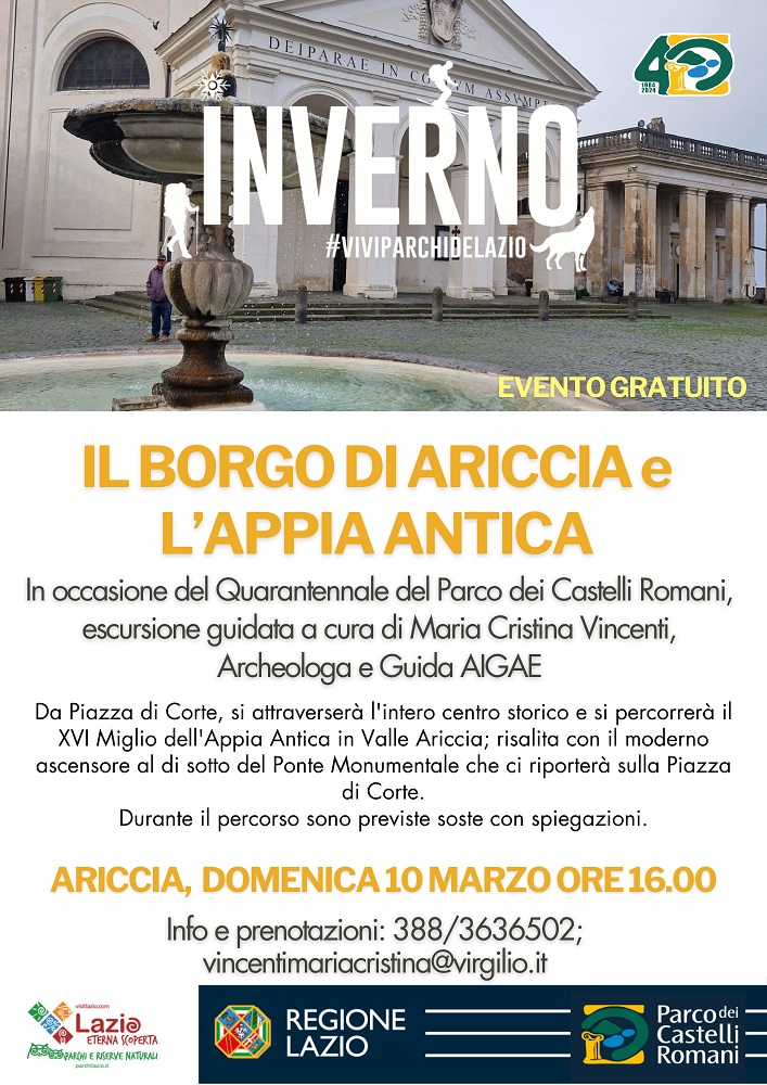 Appuntamento domenica 4 marzo alle ore 16:00, per l'escursione guidata dall'archeologa Maria Cristina Vincenti, che da Piazza di Corte attraverserà l'intero centro storico, percorrendo il XVI Miglio dell'Appia Antica in Valle Ariccia. Con il moderno ascensore al di sotto del Ponte Monumentale, si risalirà a Piazza di Corte. Tutti i dettagli nella locandina allegata.