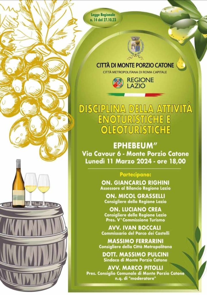 Il commissario del Parco regionale dei Castelli Romani, avv. Ivan Boccali, parteciperà all’incontro sulla “Disciplina delle attività enoturistiche e oleoturistiche”, che si svolgerà lunedì 11 marzo alle ore 18:00, presso i locali dell’Ephebeum a Monte Porzio Catone (RM).